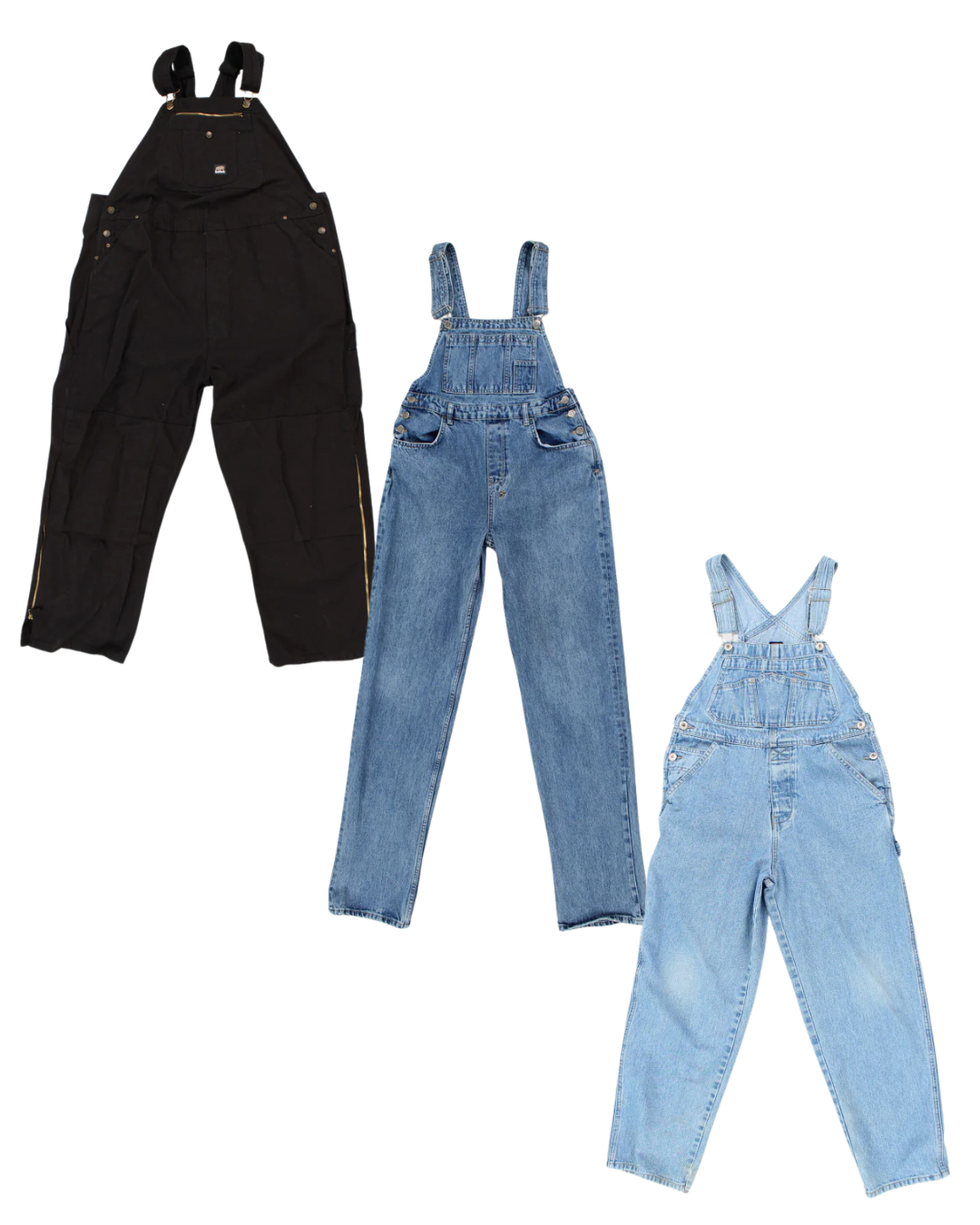 Mixed denim dungarees and overalls – mostly high street brands but bundles also include some older vintage pieces. Full-length and shorts, ideal for Y2K styling.