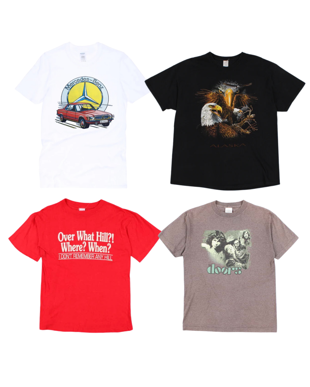 Mixed tees with graphic prints across themes – band tees, animal prints, nature, cartoon brands, mix graphics as well as Hard Rock Cafe & Harley Davidson tees.