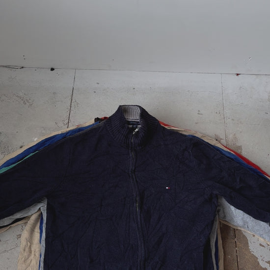 A selection of Tommy Hilfiger jumpers in various colours and styles, including round neck, V-neck, zip-up, half-zip, button-up, and sweater vests - please see example video below.
